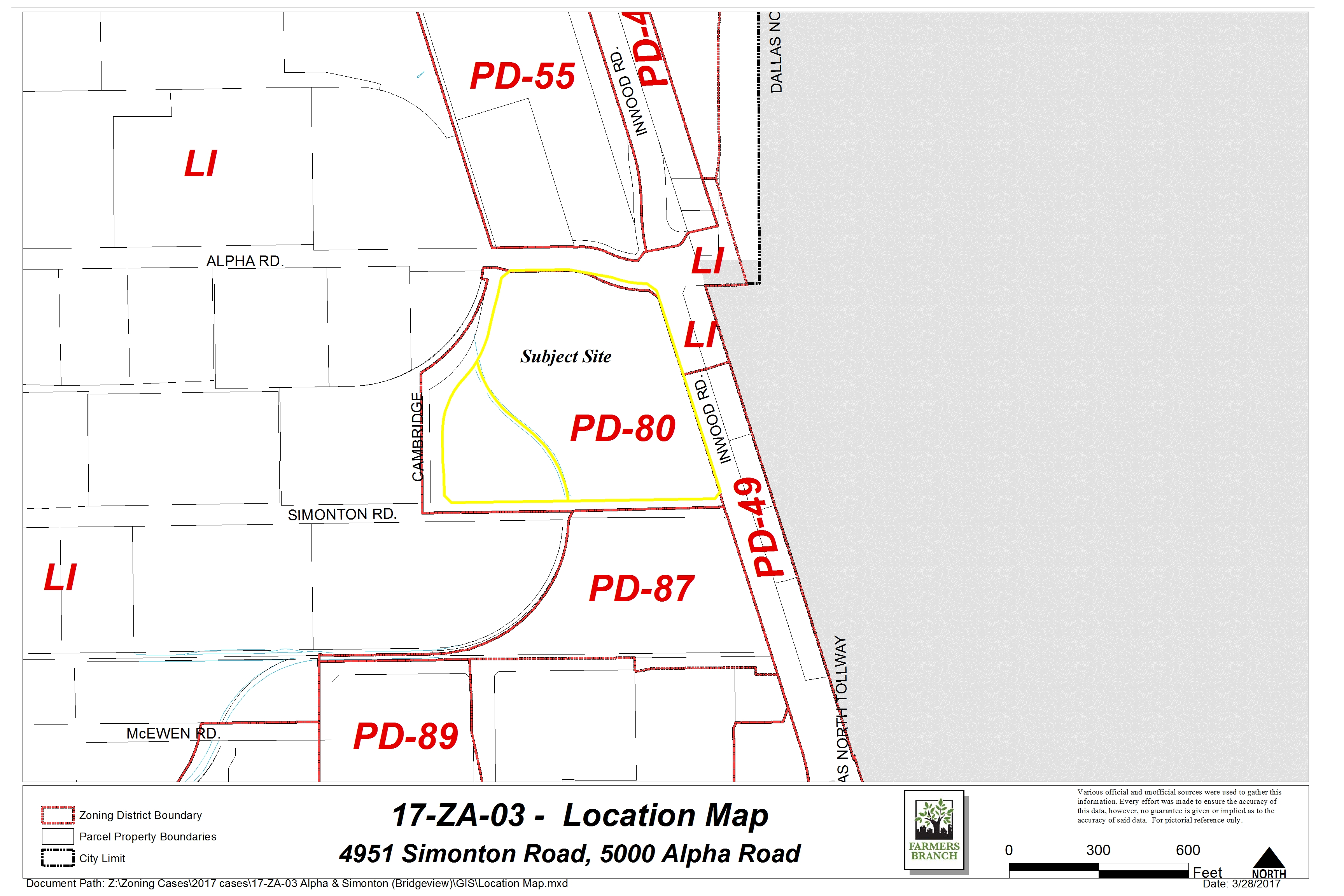 The applicant, BV Alpha LLC / Bridgeview, is proposing to redevelop the entire block between Alpha Road, Inwood Road, Simonton Road and Cambridge Concourse into a mixed-use development that will contain multi-family, hotel, office, restaurant and retail uses. The Conceptual Site Plan for PD-80 will also be amended with this zoning amendment.